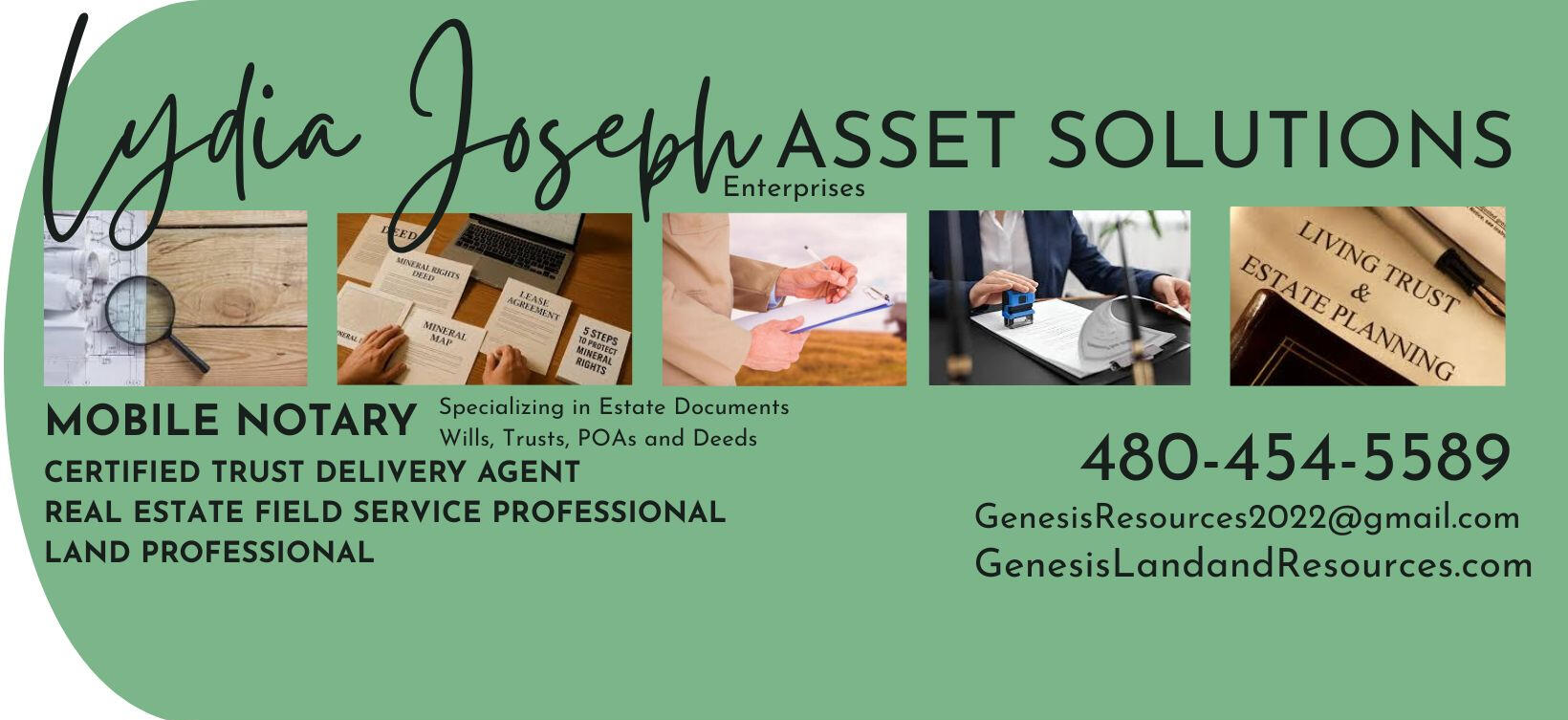 We created the Asset Solutions Division of Genesis Land and Resources out of our own need as Real Estate and Natural Resource Investors for help out in the field to perform due diligence, manage our own assets, and solve problems.Utilizing Land Professionals and Site Inspection Services enabled us to make more informed decisions about acquisitions and helped us keep an eye on our assets once we owned them.The efficiency and convenience of Mobile Notary services saved time and money when needing paperwork handled for a transaction, an estate plan, or a client.